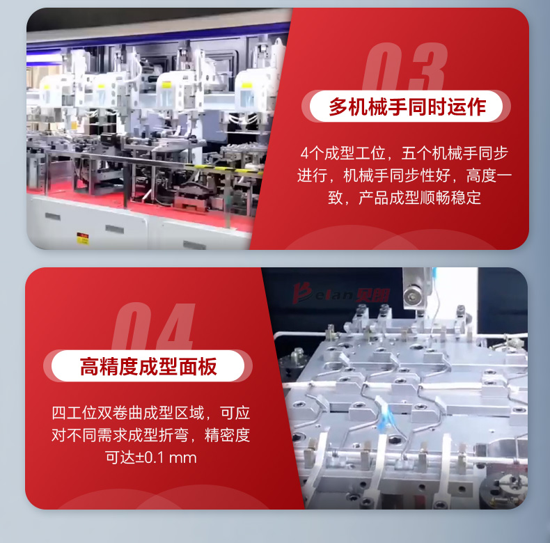 2、設備由35~58個伺服及部分氣動多工位折彎成型可根據產品尺寸任意調整數據,單個工位可同時折彎多個角。